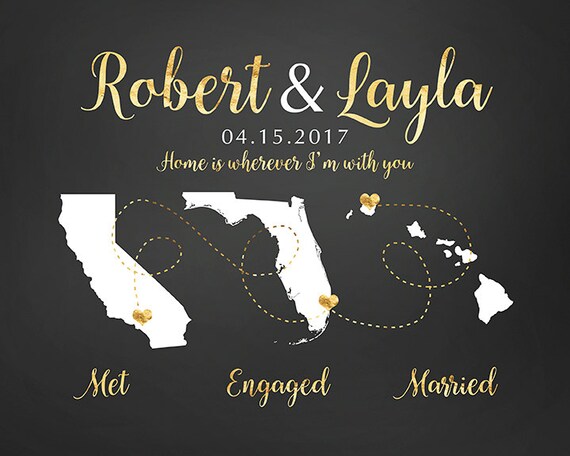 Met Engaged Married Maps Fiance Husband Personalized Gift Maps Travel Names Date Engagement Anniversary Honeymoon Gold Wf336