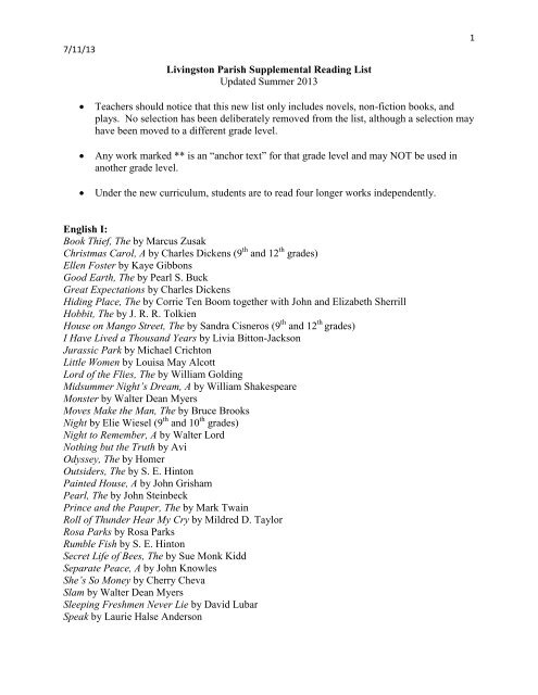 Recommended Novel Reading Lists For Grades 7 12 With Lexile Levels