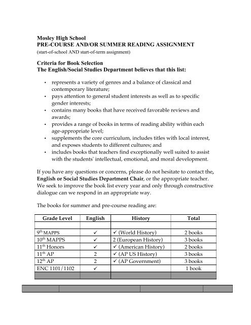 Mosley High School Pre Course And Or Summer Reading