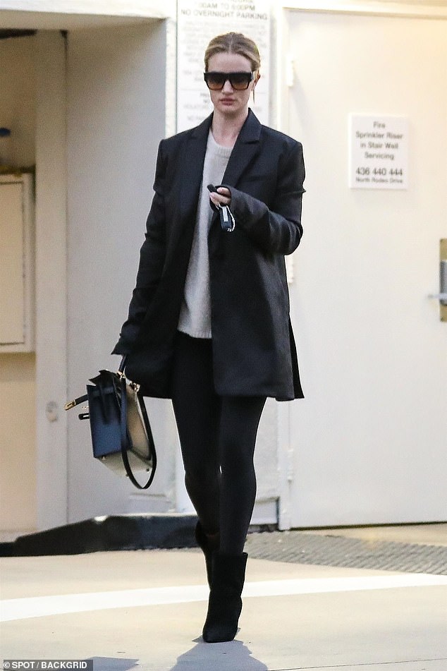 Rosie was also wearing a pair of black boots, while holding a black purse in one hand and her car keys in the other. The supermodel capped off her ensemble with a pair of sunglasses, with her hair tied back for her outing.