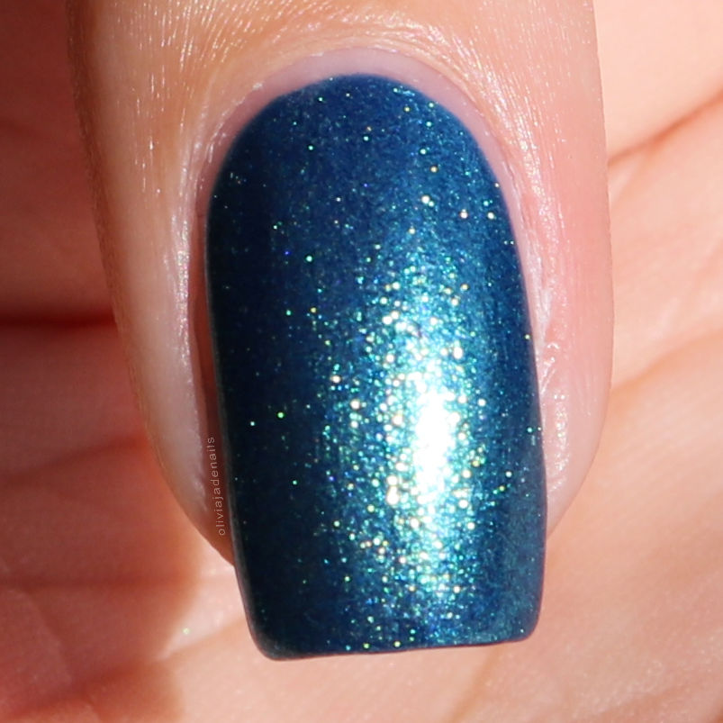 A Peacock's Charm is a green to blue multichrome with gold shimmer, blue chrome flakes and gold holographic micro glitters. I think this is such an interesting shade and the formula is fantastic. I used two coats for my swatch.
